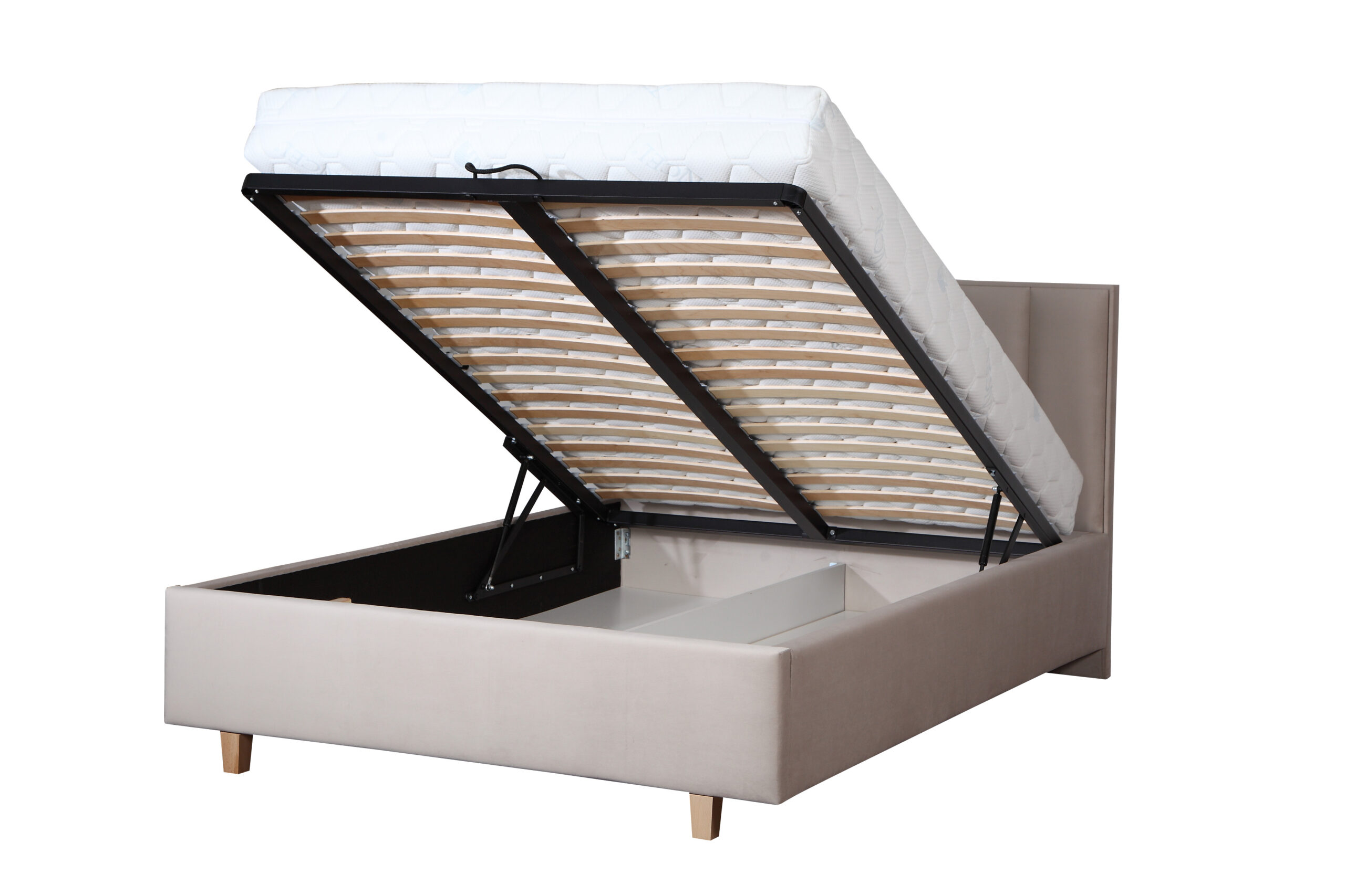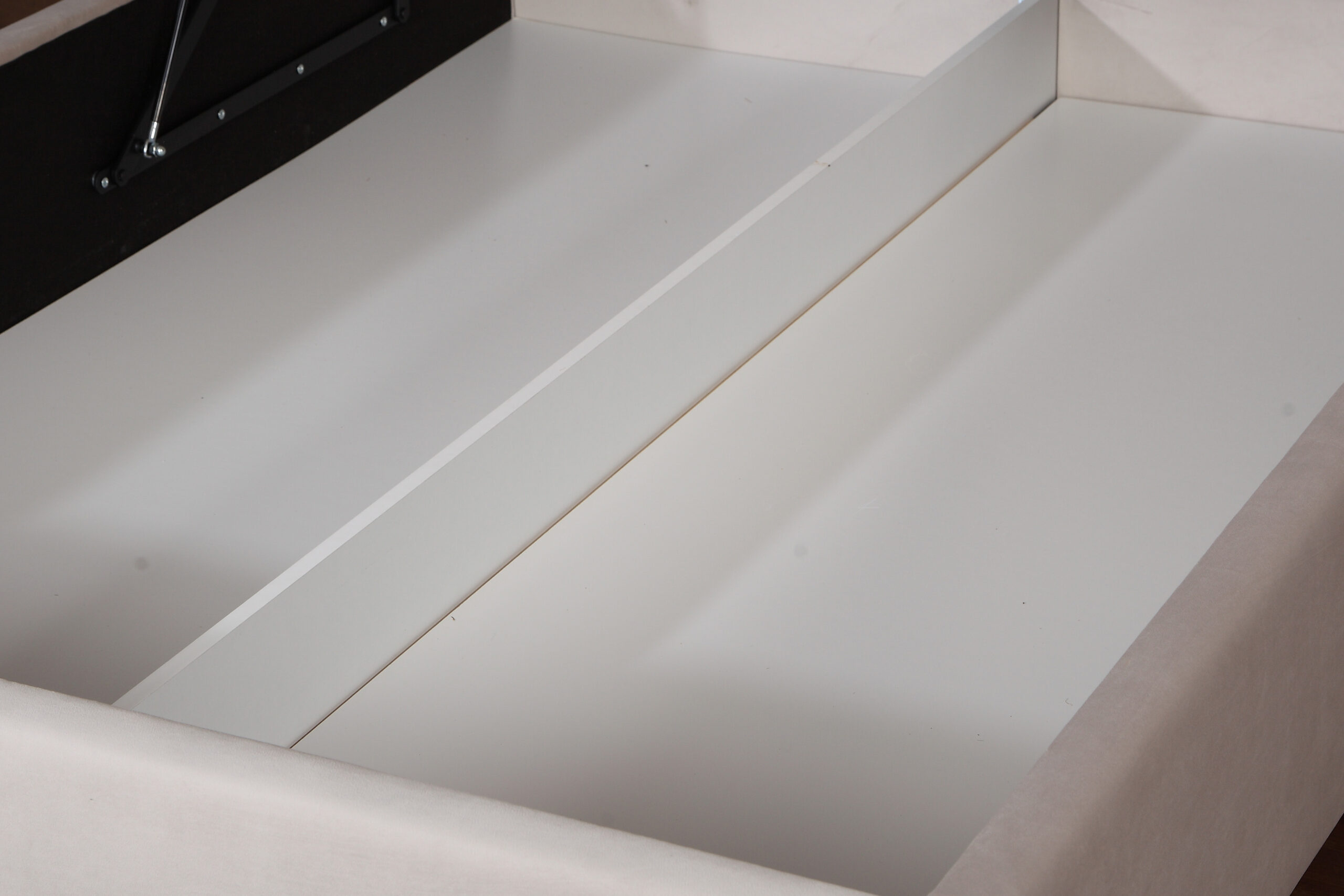 Łóżko stoi na ramie metalowej z podnośnikami gazowymi, posiada pojemnik na pościel – przegroda, pojemnik dzielony na dwoje.