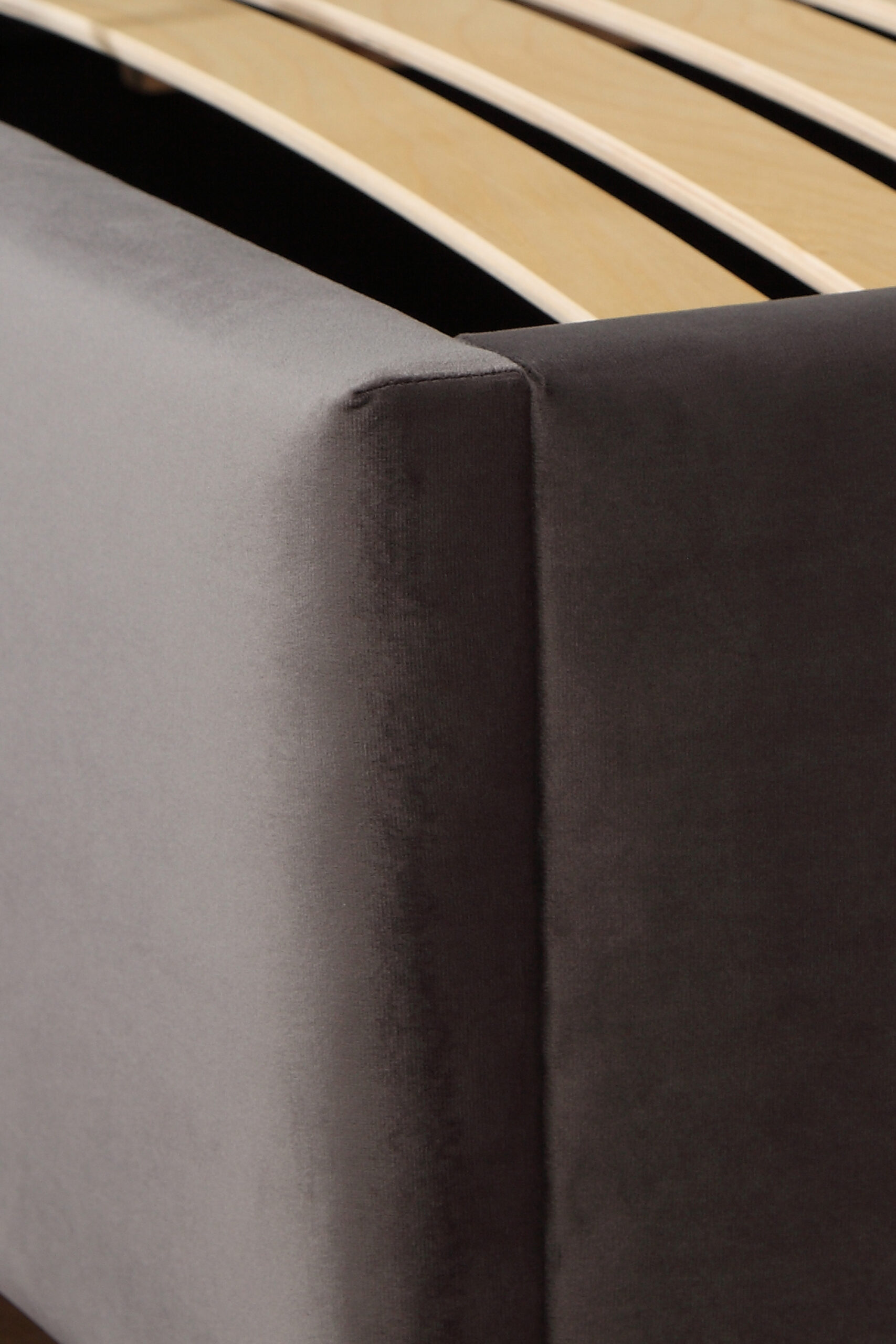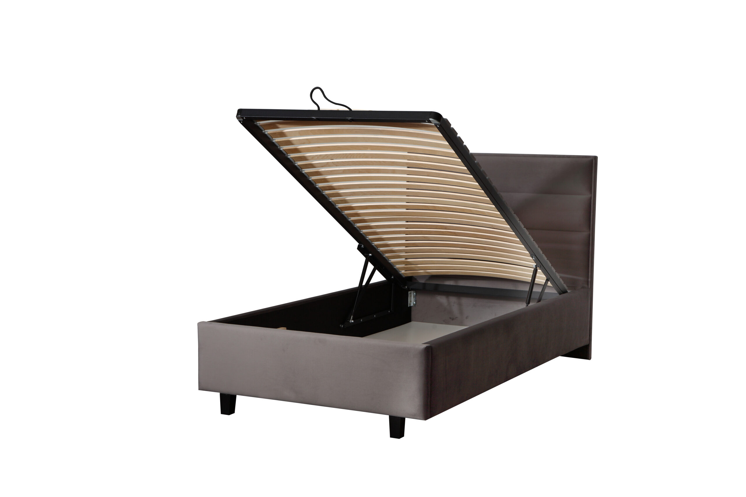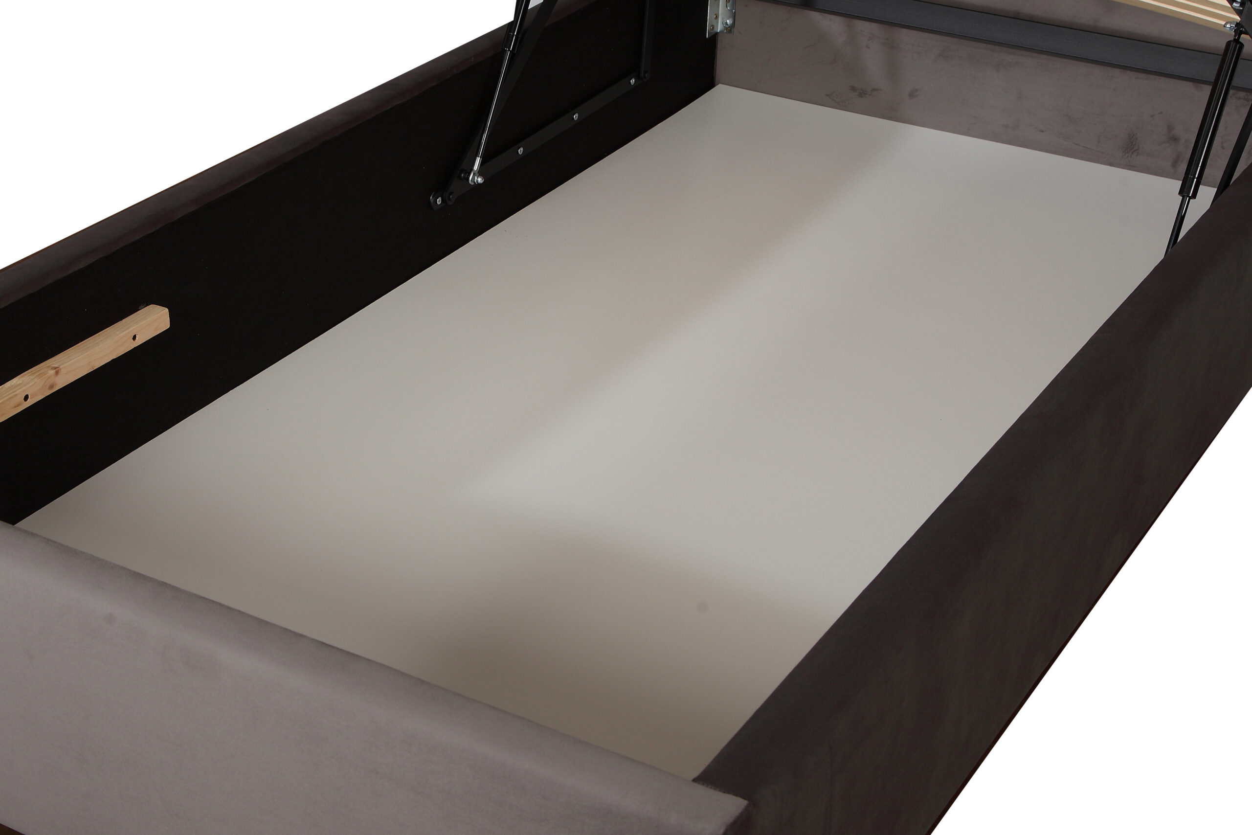Łóżko stoi na ramie metalowej z podnośnikami gazowymi, posiada pojemnik na pościel.